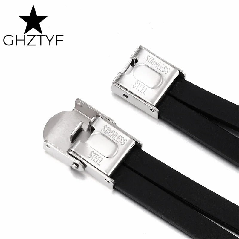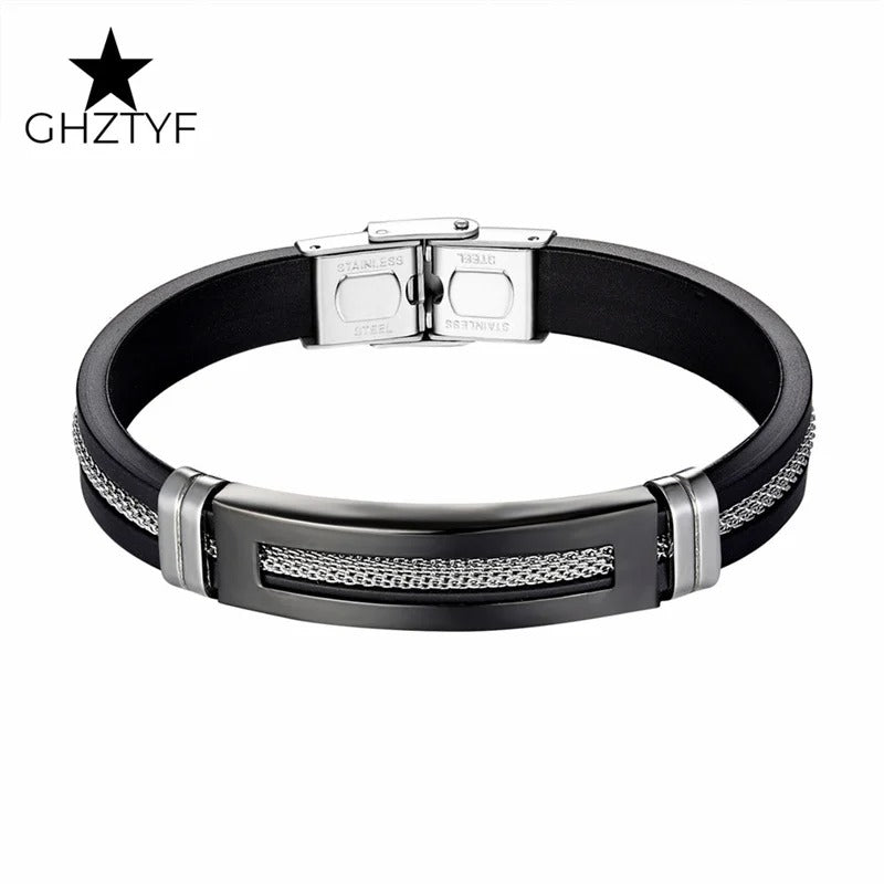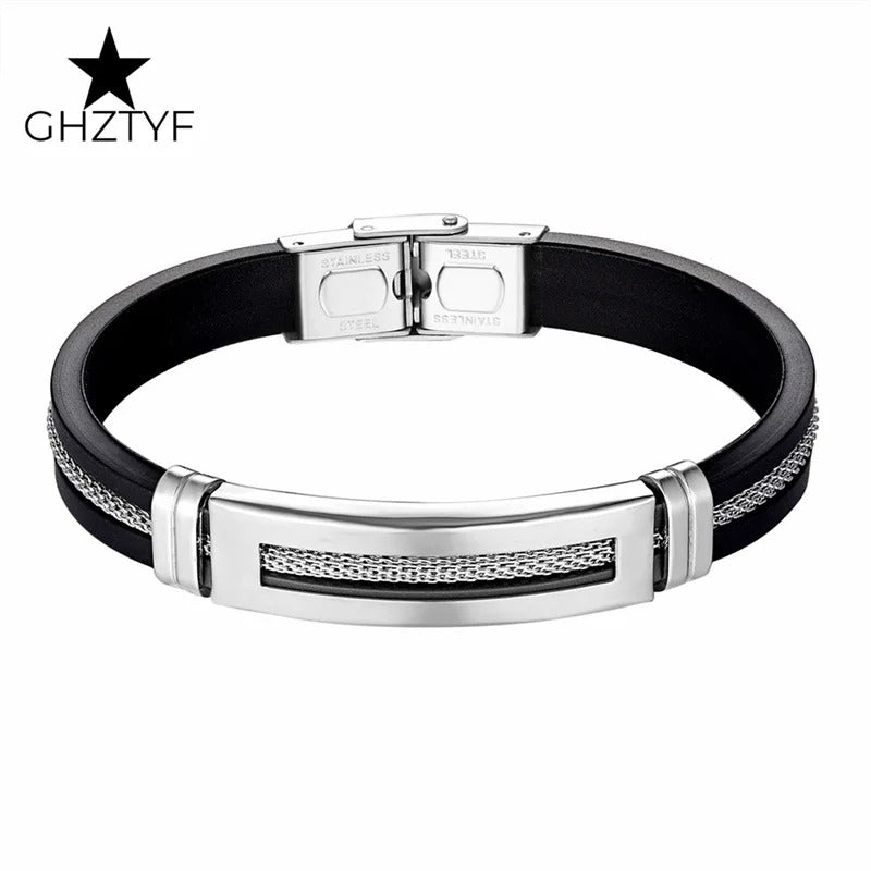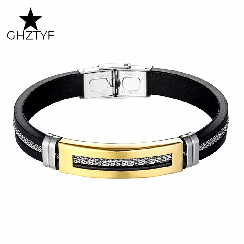 Golden Chain Stainless Steel Bracelets for Men Women Teens Black Rubber Belt Wristband Cuff Bangle Male Hand Jewelry Gifts